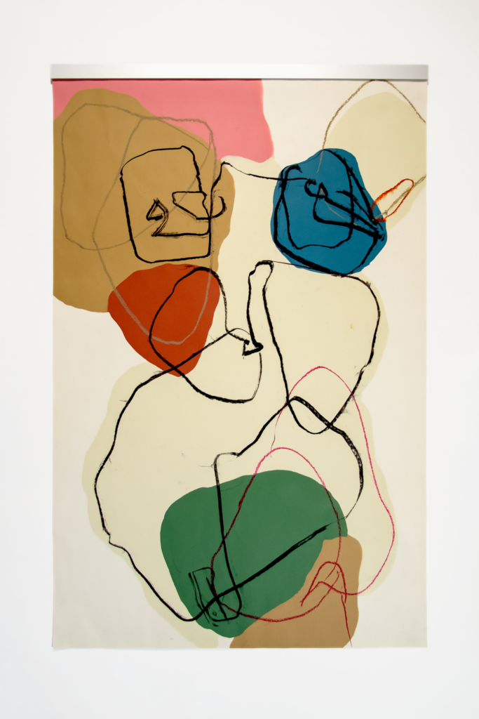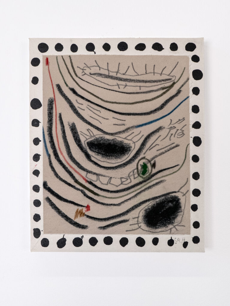 Charcoal and pastel drawing cast in silicone with resin details.