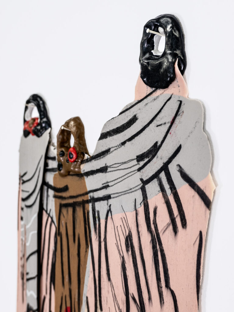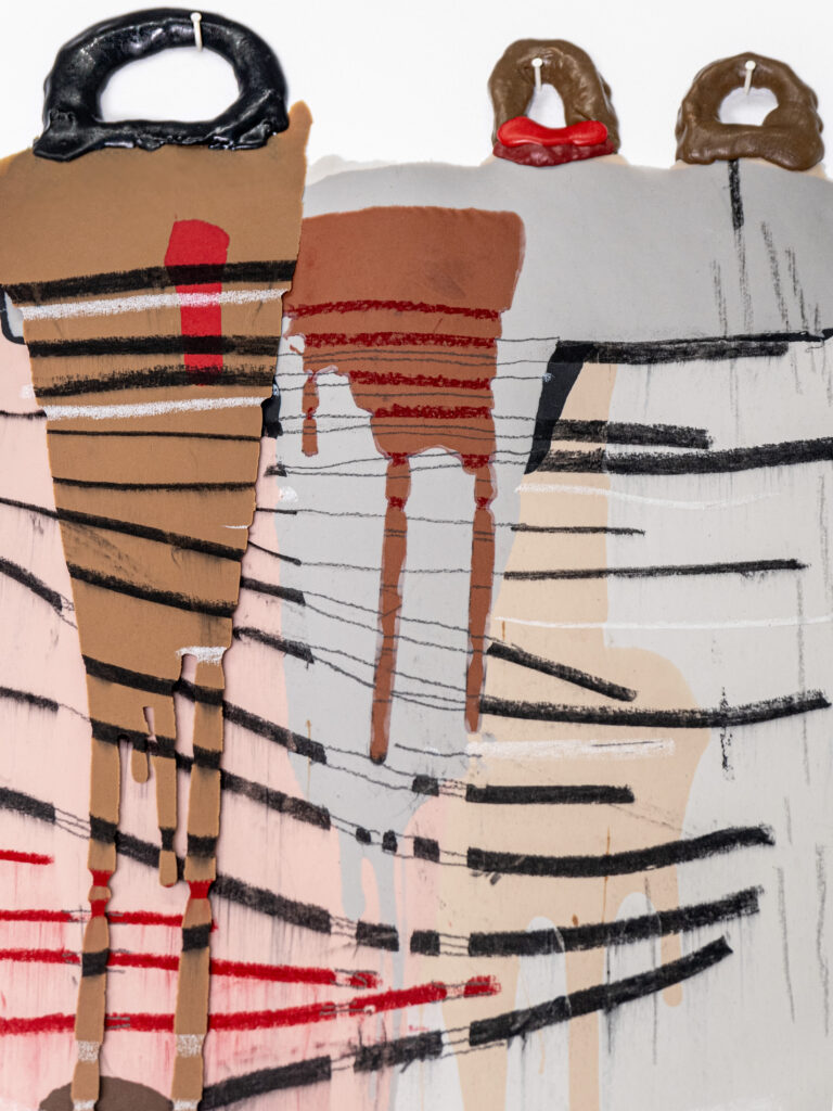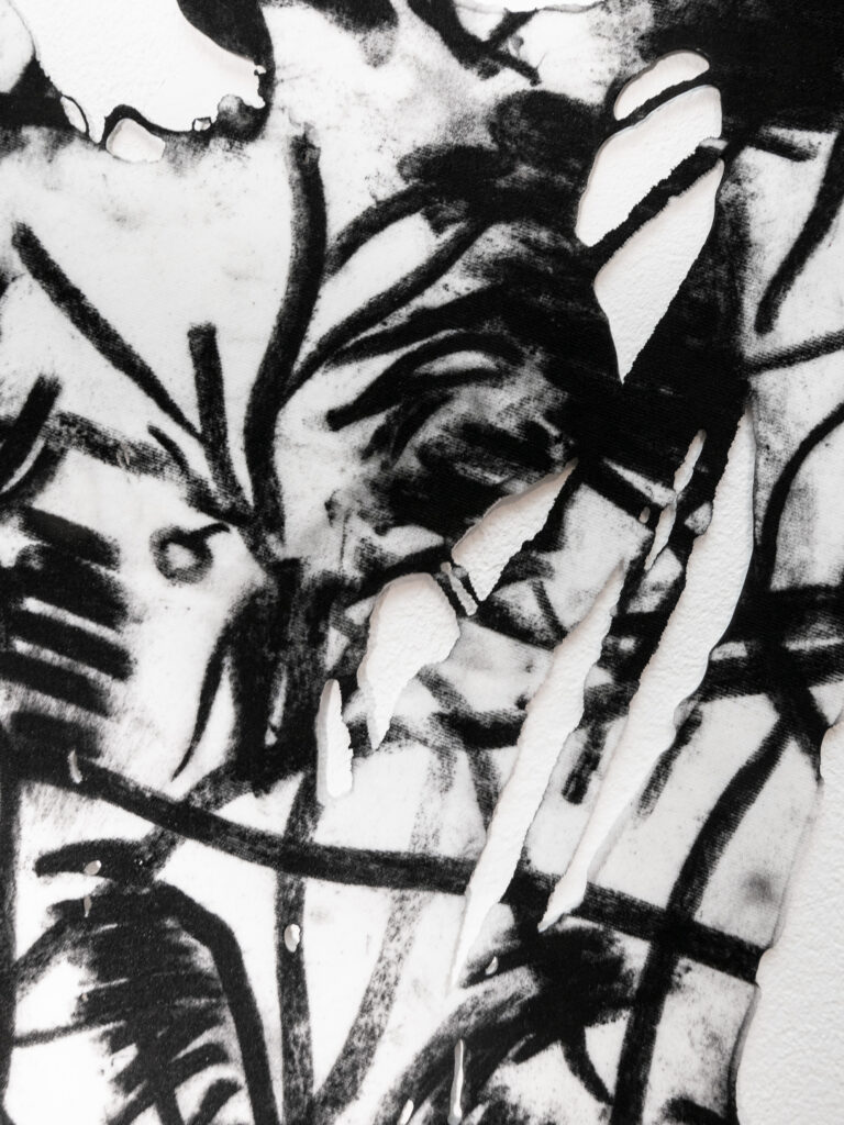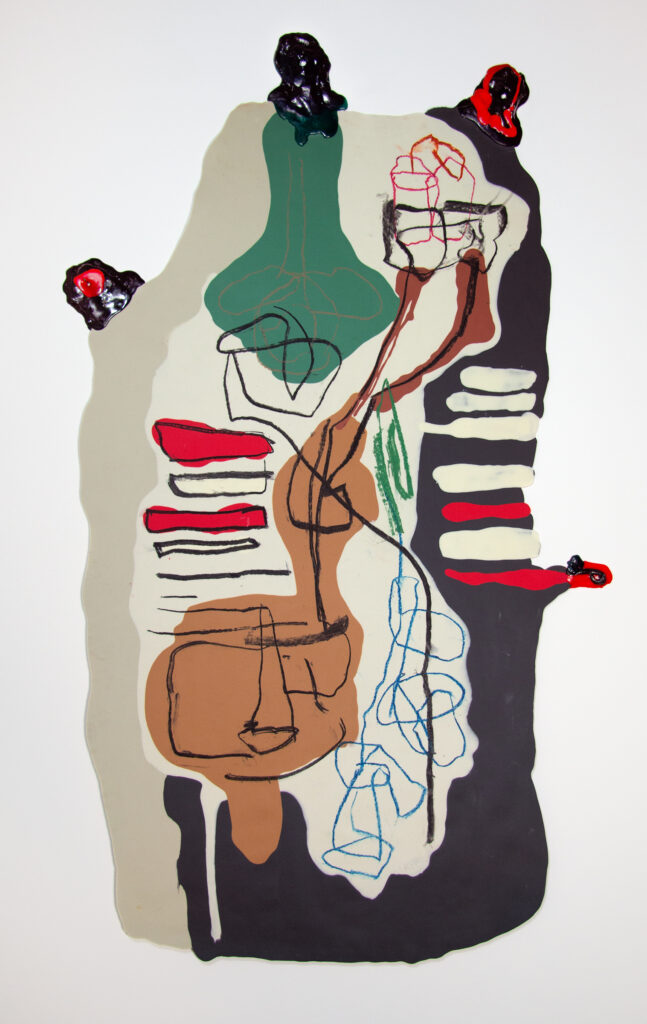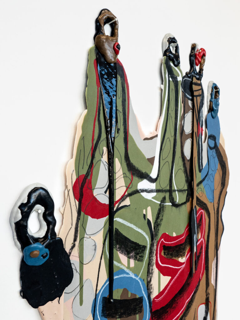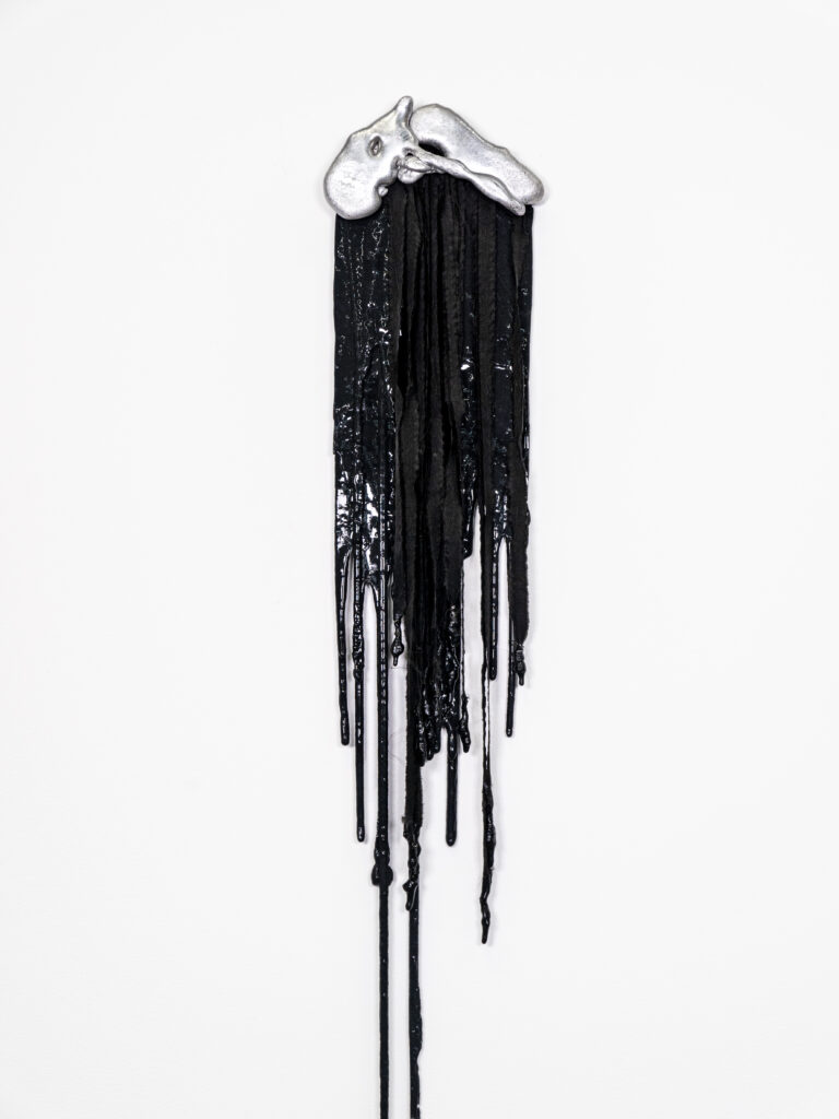 Graphite, charcoal and pastel drawing cast in silicone, with resin details.