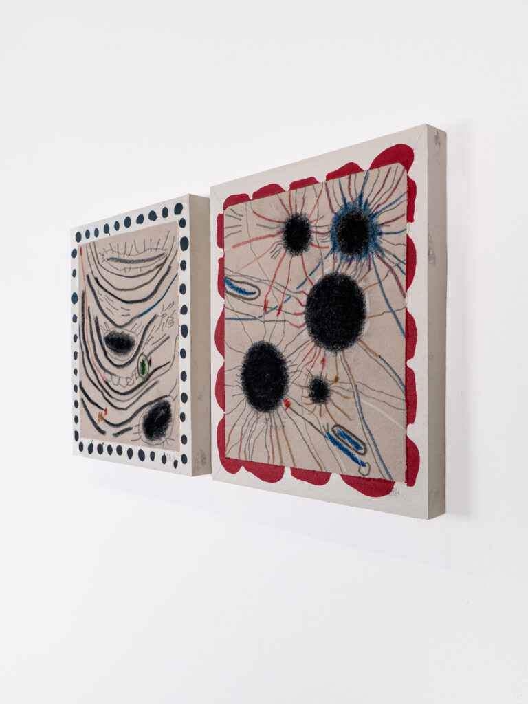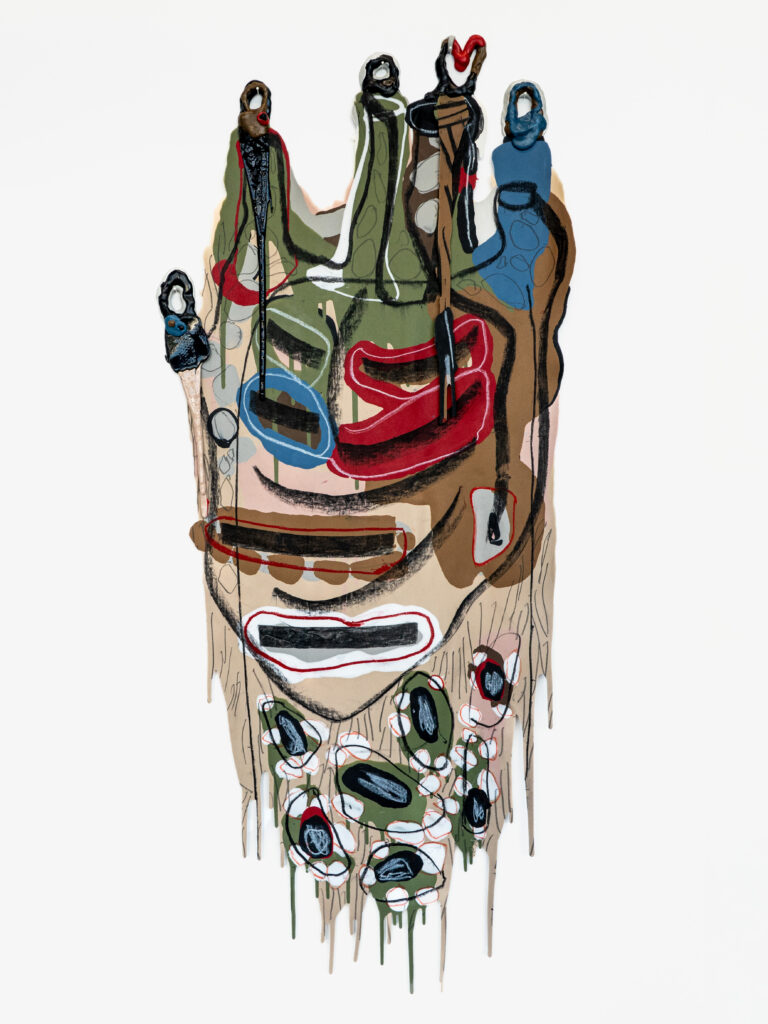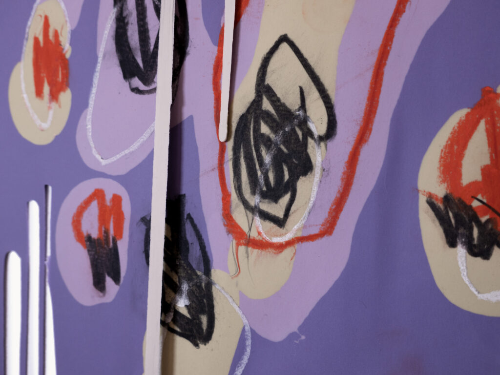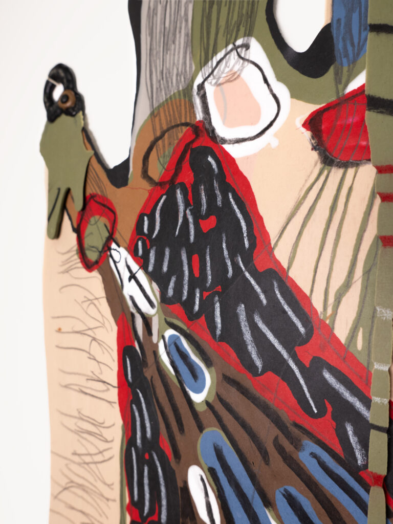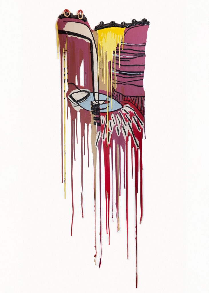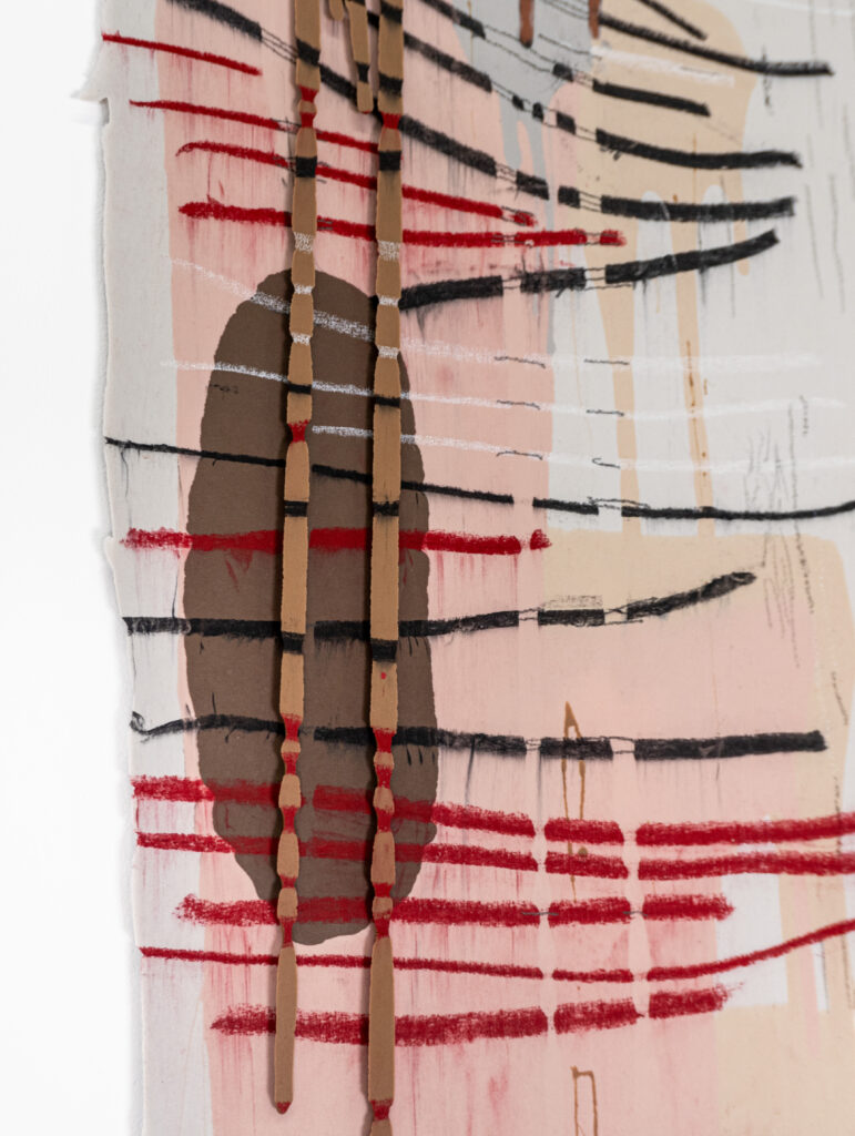 Graphite, charcoal and pastel drawing cast in silicone, with resin details.