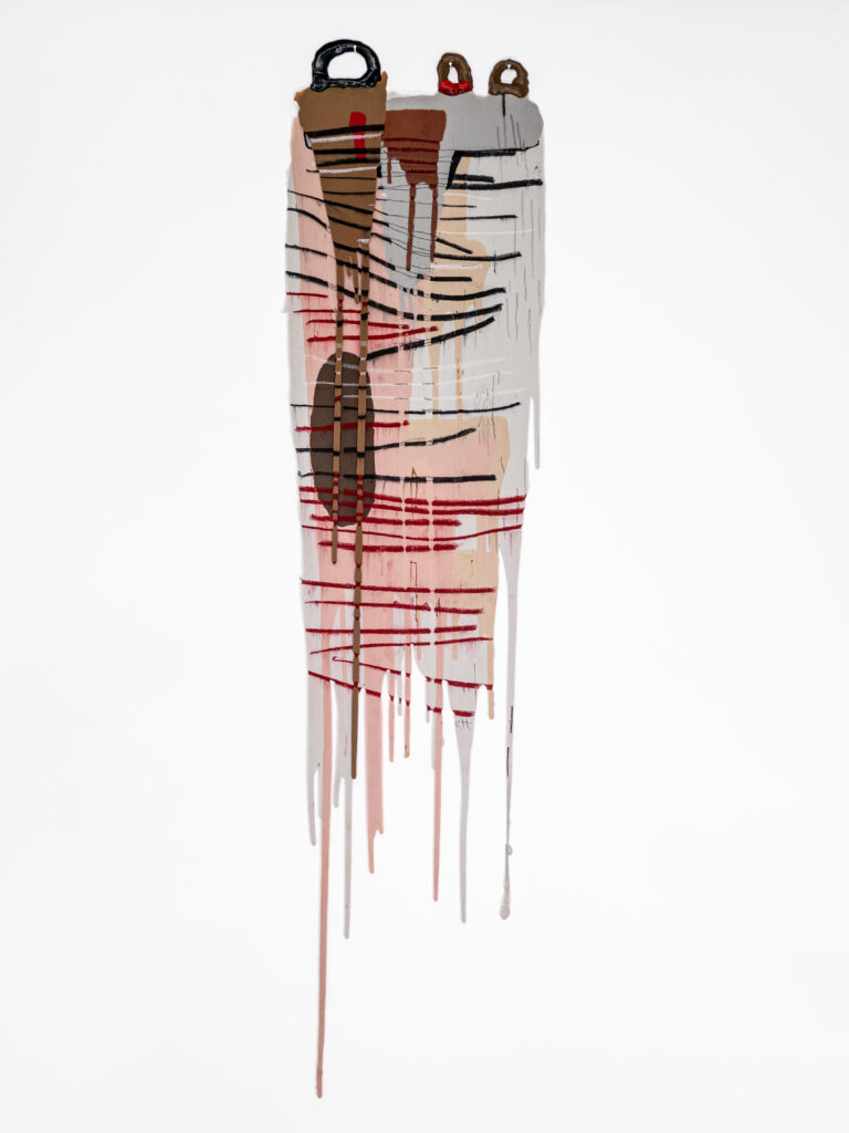 Graphite, charcoal and pastel drawing cast in silicone, with silver hangers.