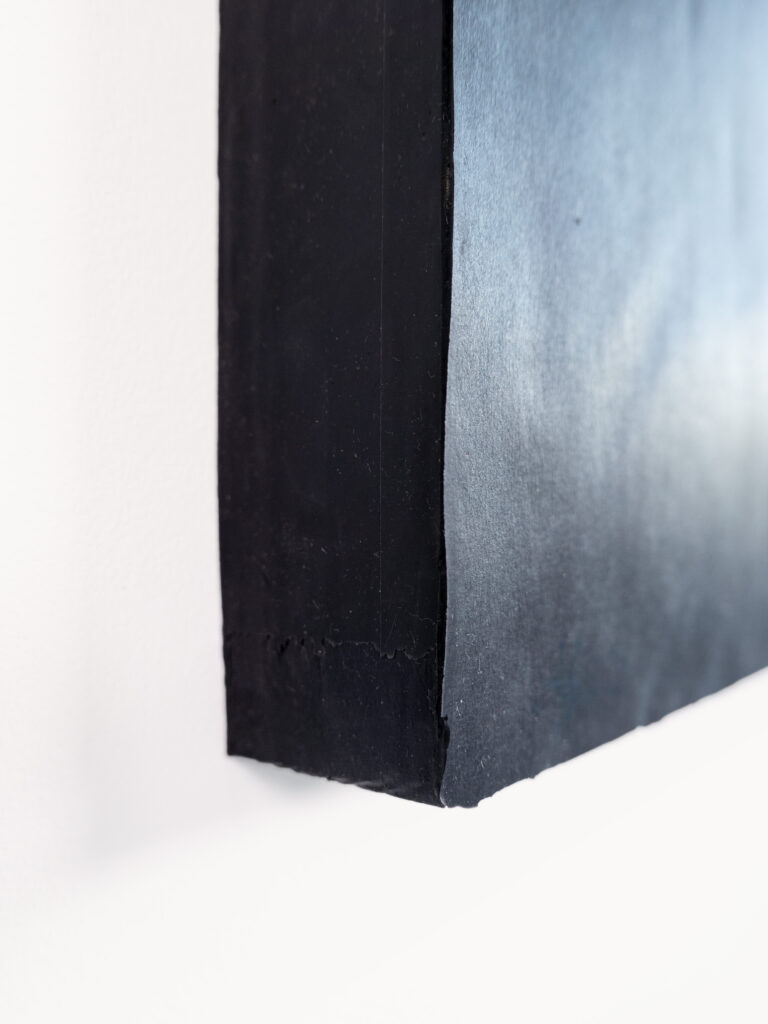 Charcoal, graphite and dry pastel drawing cast in silicone, with aluminium tube.