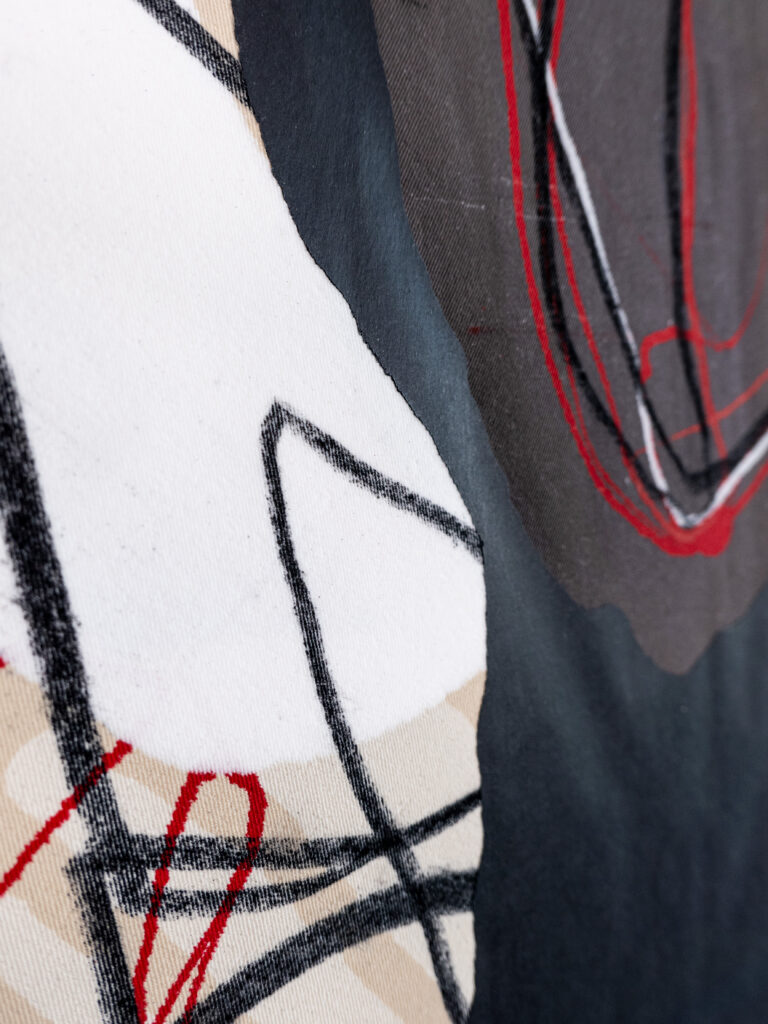 Charcoal and graphite drawing cast in silicone on top of wooden frame structure.